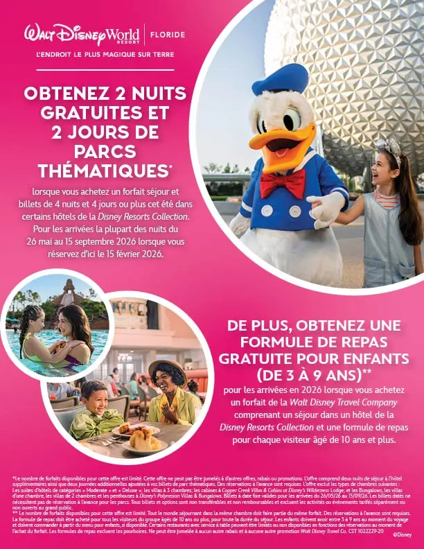 Dans le cadre de la promotion Cool KIDS’ Summer 2026, Disney offre jusqu’à 2 nuits d’hôtel et 2 journées de parc sans frais lors de l’achat d’un forfait admissible de 4 nuits et 4 jours (ou plus) incluant un hôtel Disney et des billets de parcs thématiques.